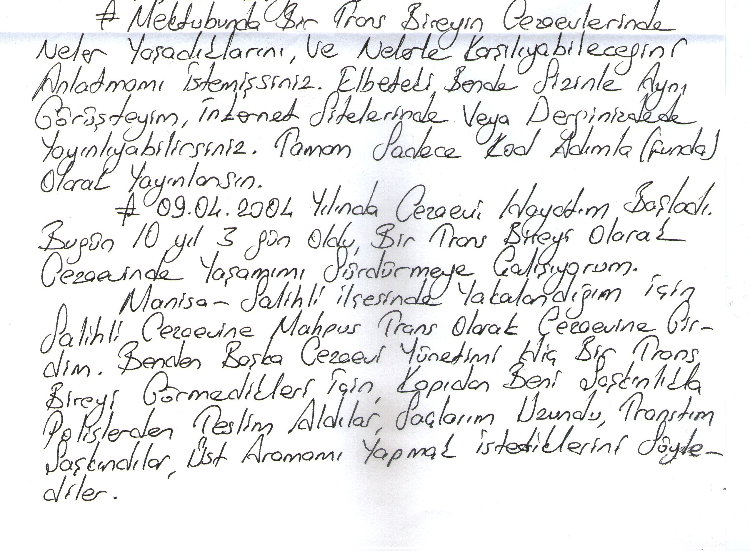 10 yıldır Türkiye hapishanelerinde tutulan trans mahpus Funda, mektubunda hapishanelerde yaşadıklarını anlatıyor. Ceza İnfaz Sisteminde Sivil Toplum Derneği ile mektuplaşan Funda, bu mektubunda sadece 2004 yılında başlayan mahpusluk hayatının ilk yıllarını anlatıyor ve sonraki mektuplarında devam edeceğini belirtiyor.