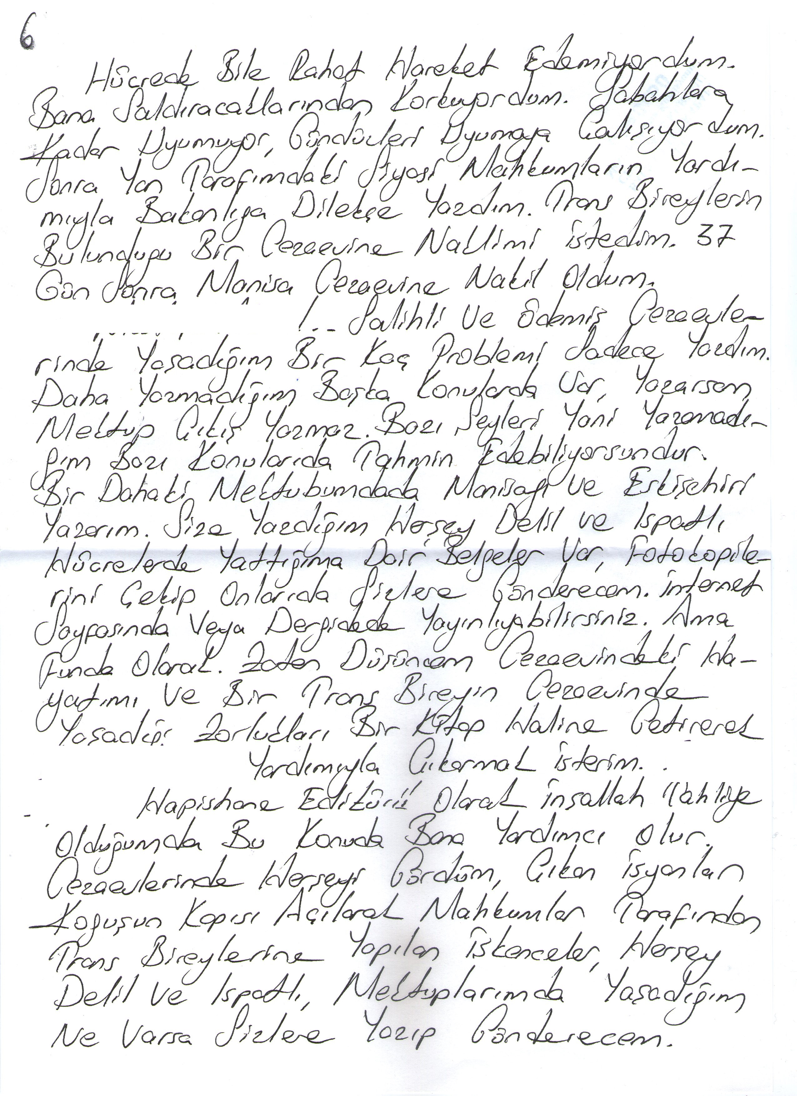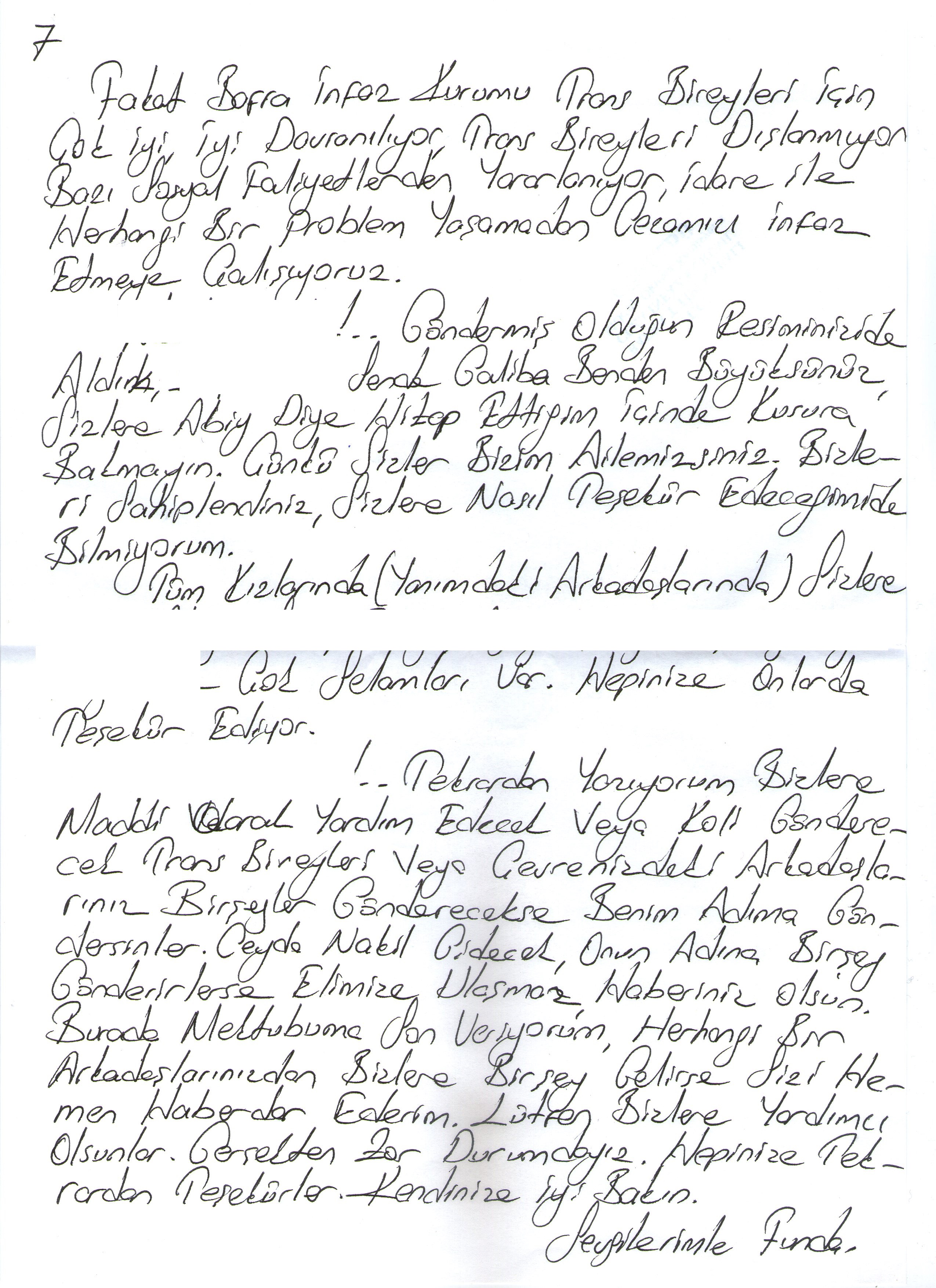 Not: Funda mektubunun sonunda zor durumda olduklarını ve yardım beklediklerini de belirtiyor. Trans mahpuslarla dayanışma göstermek isteyenler 0542 336 75 67 numaralı telefonu arayarak ayrıntılı bilgi alabilirler.