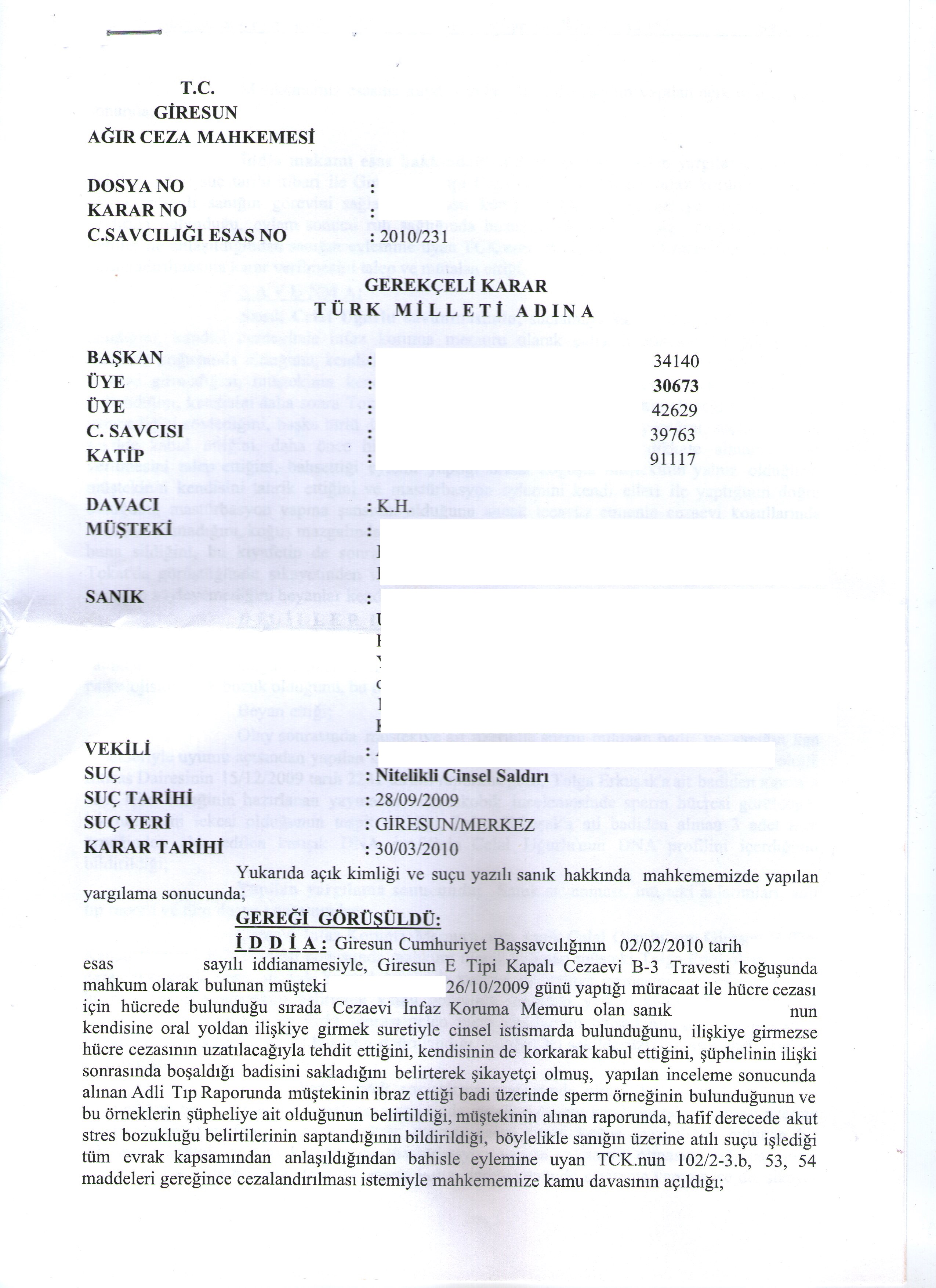 Aşağıdaki belge taciz ve tecavüz iddiasının mahkemeye ulaştırılabildiği ve sonuç alınabilen nadir örneklerden birisi. Buna rağmen, anlatımlar dikkatli bir şekilde okunabilmeli ve LGBTİ mahpusların hapishanelerde karşılaşabilecekleri kötü uygulamaların neler olabileceği anlaşılmaya çalışılmalıdır.