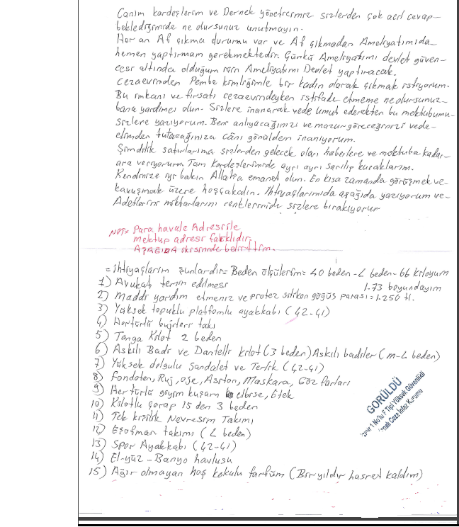 İzmir 1 No’lu F Tipi Kapalı Hapishanesi’nden yazan bir LGBTİ mahpus cinsiyet geçiş ameliyatı için avukat ve silikon meme protezi için maddi yardım talebinde bulunmuştur. Mahpusun diğer acil ihtiyaç listesi şu şekildedir: