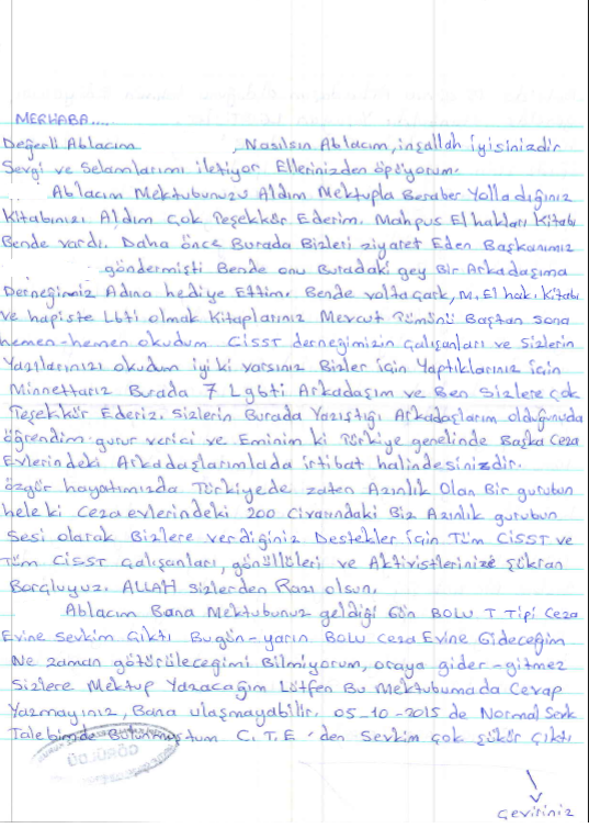 Eskişehir H Tipi Kapalı Hapishanesinde bulunan eşcinsel mahpusun hasımlarıyla birlikte aynı koğuşta tutulması sebebiyle yaşadığı sıkıntıları blogumuzda paylaşmıştık. Mahpus, sorunların devam ettiğini, bu sebepten koğuş yaktığını ve en kısa zamanda avukatla görüşmek istediğini belirtmiş konuyla ilgili Ceza İnfaz Sisteminde Sivil Toplum Derneği (CİSST) olarak başvurularda bulunmuştuk. Eşcinsel mahpus göndermiş olduğu son mektubunda çabalarımızın sonuç verdiğini, Bolu Hapishanesi’ne sevk edildiğini yazdı. Mahpusun göndermiş olduğu mektubu sizlerle paylaşıyoruz.