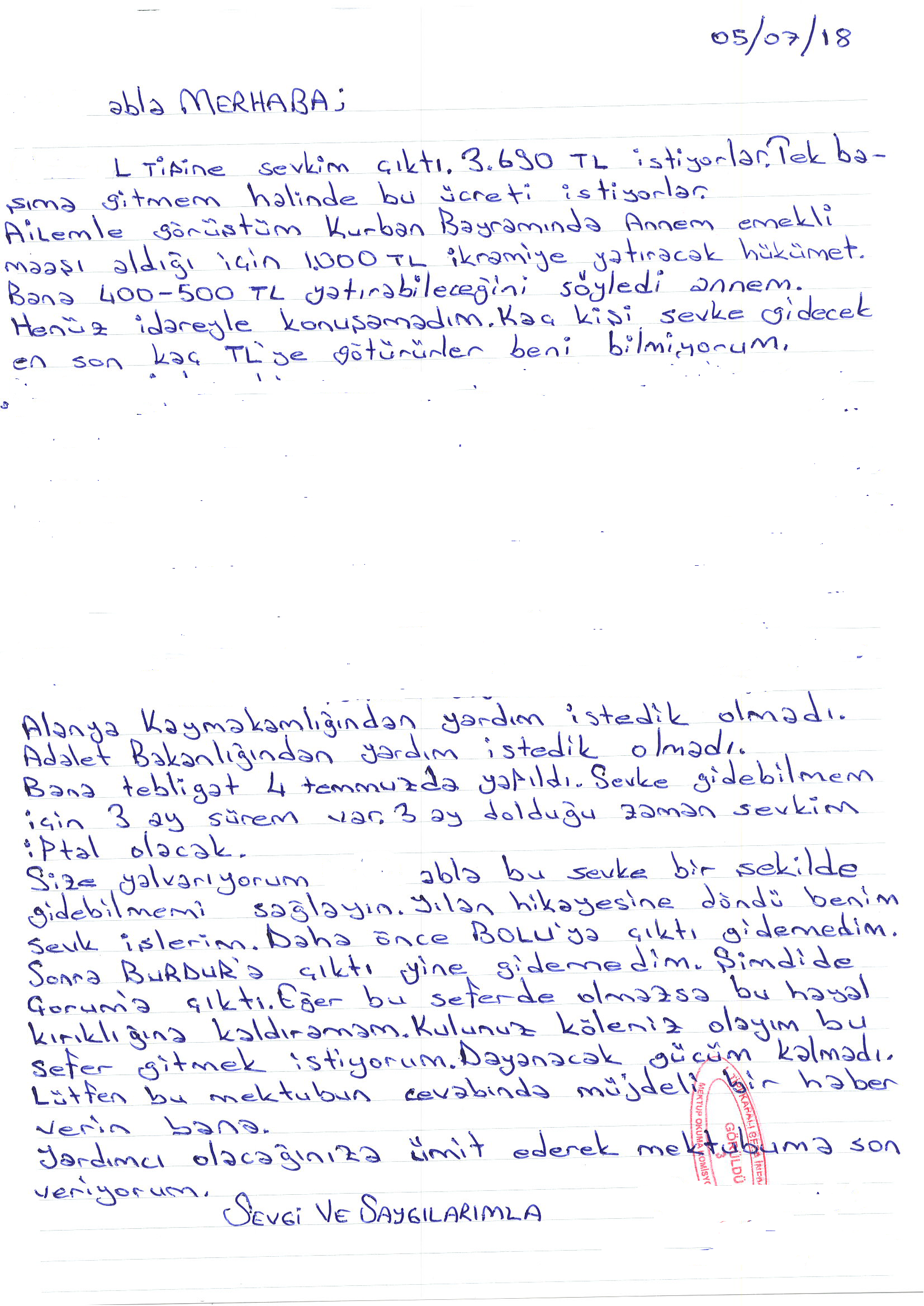 Derneğimize 05.07.2018 tarihinde mektup yazan Alanya L Tipi Kapalı Ceza İnfaz Kurumunda kalan LGBTİ mahpus sevk edilmek istediği şehir için kendisinden 3.690 TL istediklerini ve maddi imkanın yeterli olmadığını belirtmiştir. Mahpus aynı sebepten dolayı Bolu ve Burdur hapishanelerine sevki çıkmasına rağmen gidememiş, LGBTİ mahpusların olduğu koğuşlarda kalamamıştır.