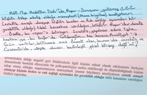 Kocaeli Üniversitesi (KOÜ) Tıp Fakültesi Araştırma ve Uygulama Hastanesi Adli Tıp Anabilim Dalı’nın verdiği raporda, söz konusu augmentasyon mamoplasti (meme büyütme) ameliyatının “estetik amaçlı olmayıp kişinin beden ve ruh sağlığı açısından bir gereklilik olduğu” belirtilirken, Sağlık Bakanlığı’ndan cezaevine gönderilen yazıda Sağlık Uygulama Tebliği’ne göre estetik amaçlı olmayan operasyonların kurum tarafından karşılandığı ifade edildi.